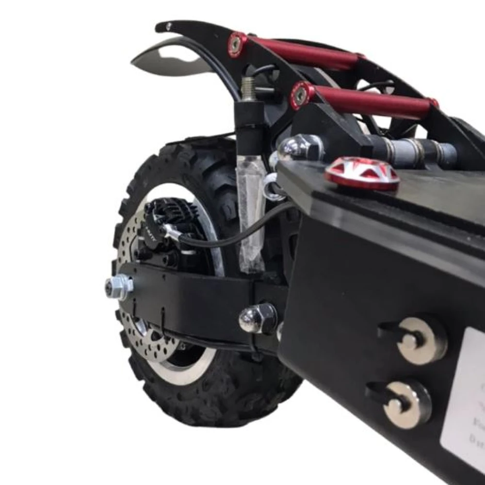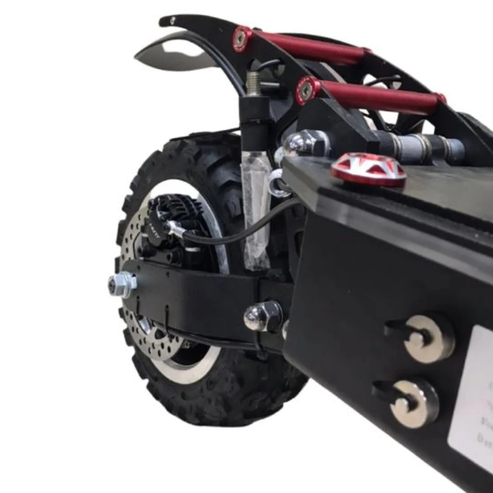 Мощность 6000 Вт (два мотора по 3000 Вт) позволяет разгоняться до 85 км/ч и преодолевать подъемы до 30 градусов даже при полной нагрузке 150 кг, сохраняя стабильность на неровностях благодаря пневматическим 10-дюймовым колесам с протектором. Аккумулятор 60 В 38.4 Ач (литий-ионный) дает реальный пробег 60-90 км в Eco-режиме (экономия энергии за счет снижения скорости до 40 км/ч), 40-60 км в Drive и 30-50 км в Sport/Turbo при агрессивной езде; энергоэффективность повышается рекуперативным торможением, возвращающим до 10% энергии. Гидравлические дисковые тормоза с рекуперацией останавливают самокат за 3-4 метра с 50 км/ч; время зарядки 6-8 часов от двух 3А-зарядок, без быстрой опции, но параллельная зарядка сокращает ее вдвое.​