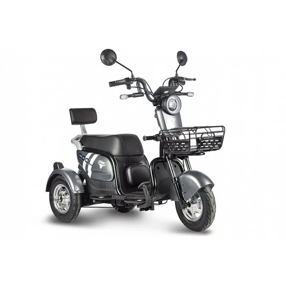 При мощности двигателя 650 Вт трицикл способен выдавать скорость 25 км/час и преодолевать на одной подзарядке до 30 км пути (АКБ не предусмотрено в комплектацию).