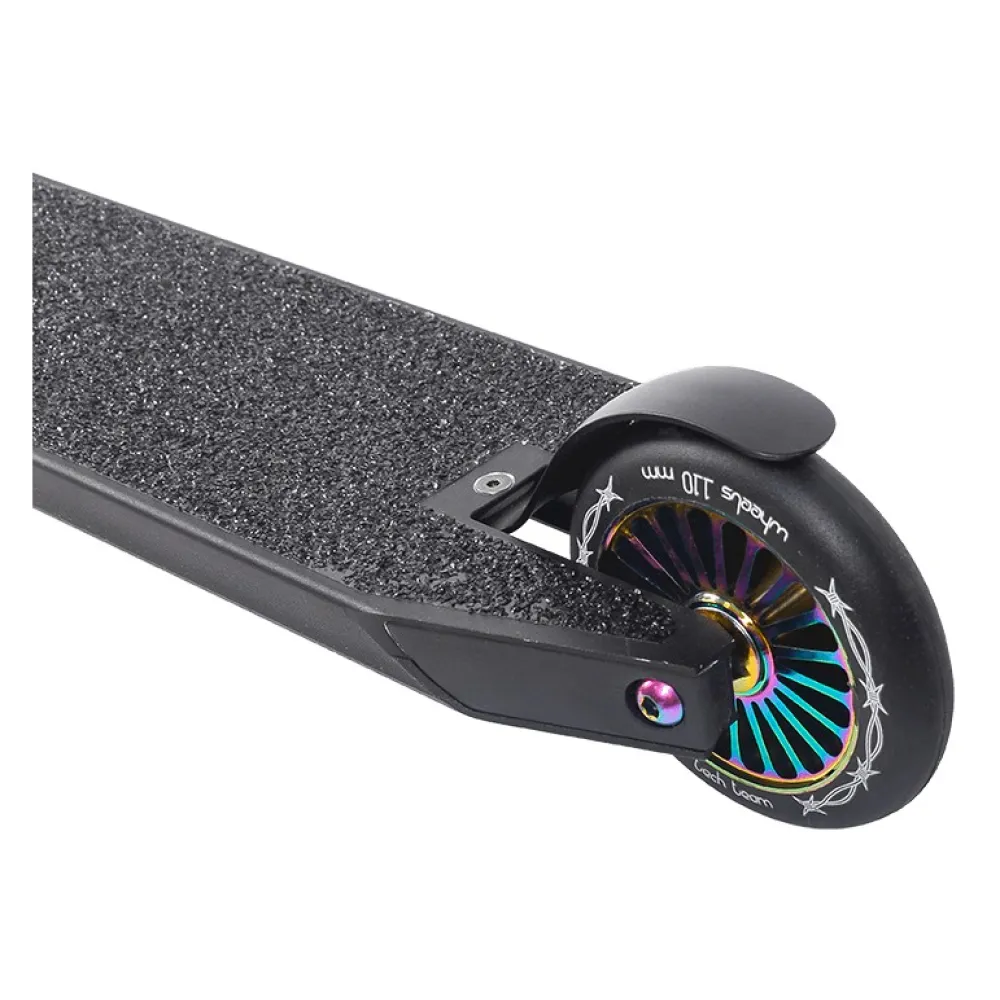 • Дека выполнена из алюминиевого сплава с маркировкой 6061. Длина деки 53 см, ширина-12.5 см. Имеет классический вид прямоугольной формы, дополненная кованными рулевым стаканом и шеей. В нижней части деки для лучшего скольжения предусмотрены рейлы. Боковина деки имеет рифлёную поверхность, это помогает надежному захвату во время выполнения непростых элементов. На деки наклеена шкурка с крупной зернистостью. Имеет стальной гибкий тормоз;